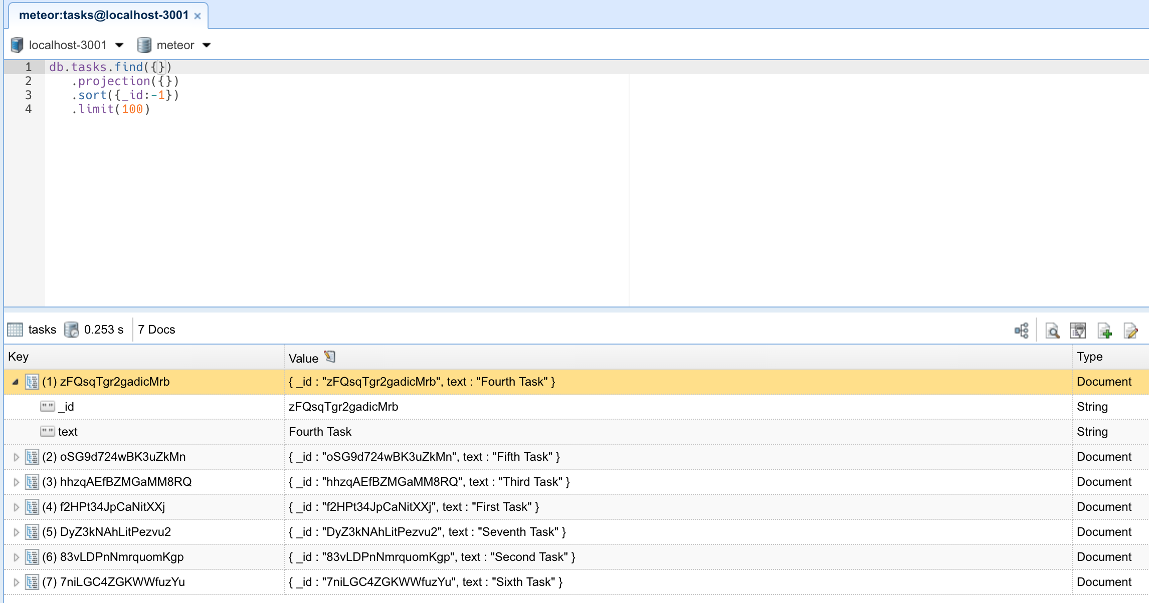 {_id: 1, text: 'First Task'},