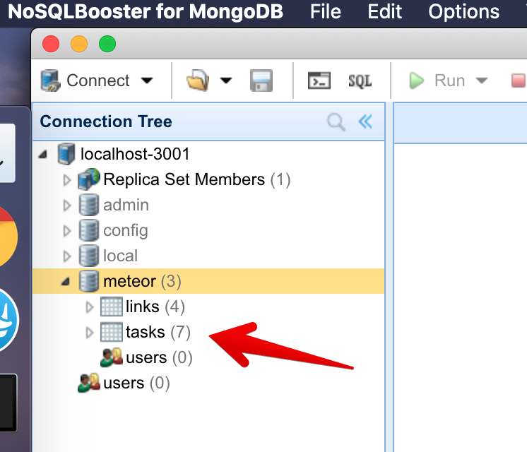 Meteor already sets up MongoDB for you. In order to use our database, we need to create a collection, which is where we will store our documents, in our case our tasks.